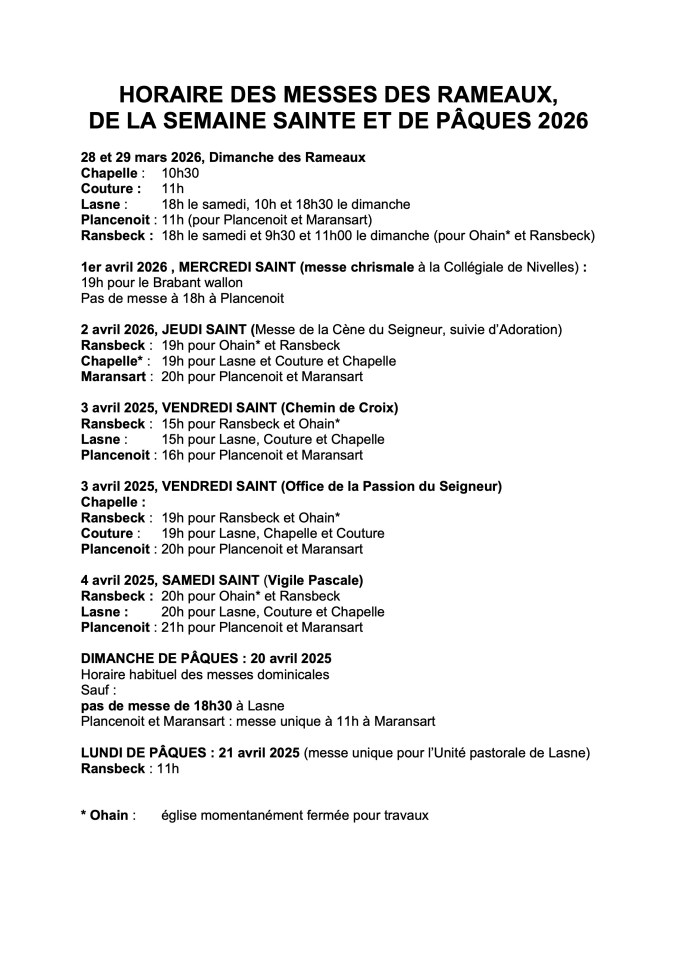 .Jusqu’à nouvel ordre, toutes les messes d’Ohain seront célébrées aux heures* habituelles (sauf la messe de 8h le dimanche temporairement supprimée).