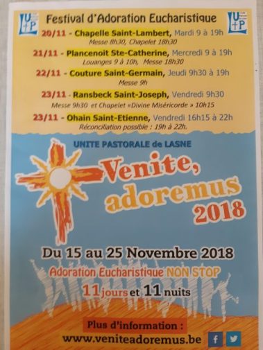 Adoration eucharistique NON STOP, 11 jours et 11 nuits d’adoration continue, de lieu en lieu, dans toute la Belgique.. (agenda 2018 disponible sur Venite Adoremus )