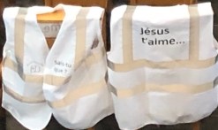 Un soleil et un ciel bleu d’hiver.. près du Delhaize, un groupe de paroissiens adultes et enfants portent des gilets blancs avec l’inscription devant « sais-tu que? » et au dos « Jésus t’aime… ».