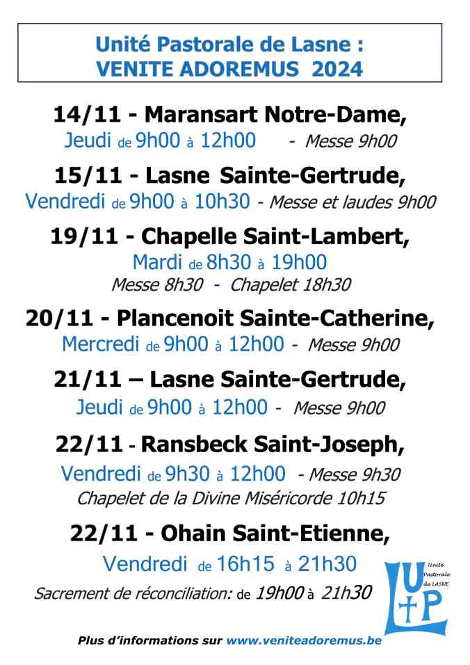 Nota Bene: Nous comptons également sur certains d’entre vous afin d’assurer une permanence (1h ou 30 min.) pour que notre Seigneur ne soit jamais seul: inscrivez-vous via le formulaire à l’entrée de l’église.