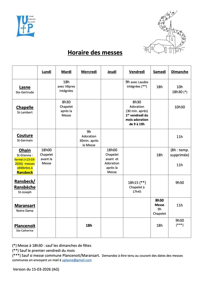 (*) excepté la messe d’Ohain à 8h le dimanche, temporairement supprimée.