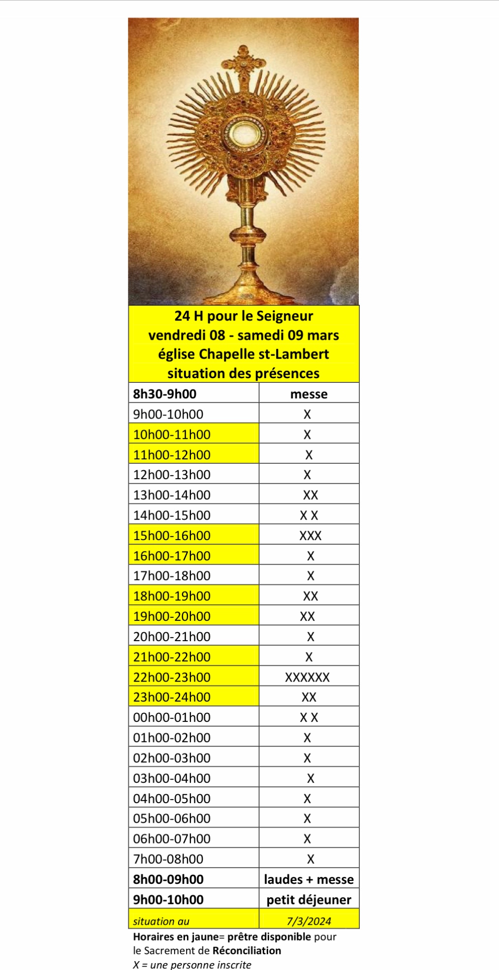 (*) Permanence: pour assurer 1 heure de présence devant le Saint-Sacrement, merci de vous inscrire de préférence par mail à uplasne@gmail.com – Pour voir la feuille d’inscription avec les heures déjà assurées, cliquez ici
